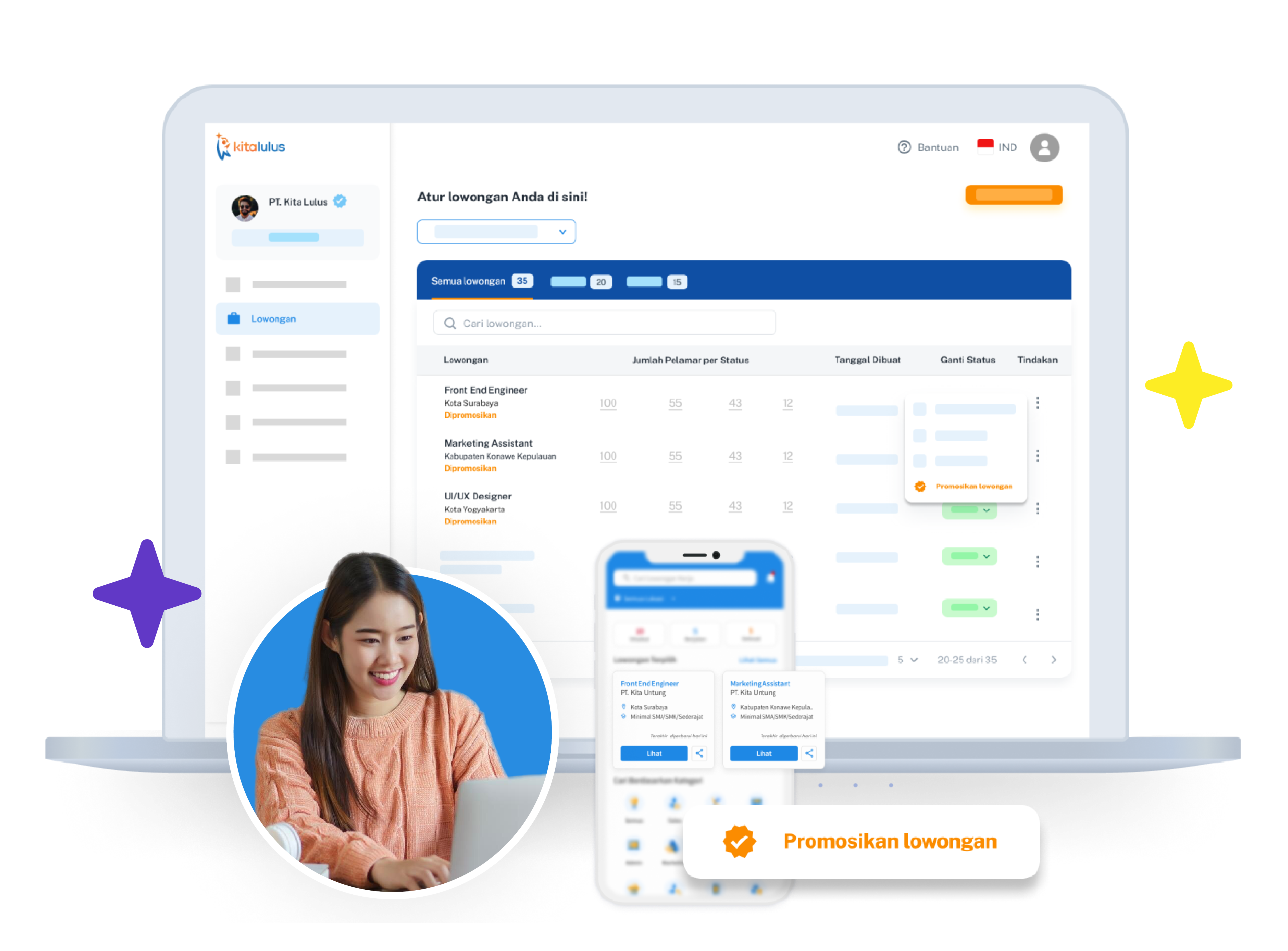 Pasang iklan lowongan kerja perusahaan Anda di KitaLulus dan mulai menyeleksi kandidat dalam 1 dasbor terpusat.