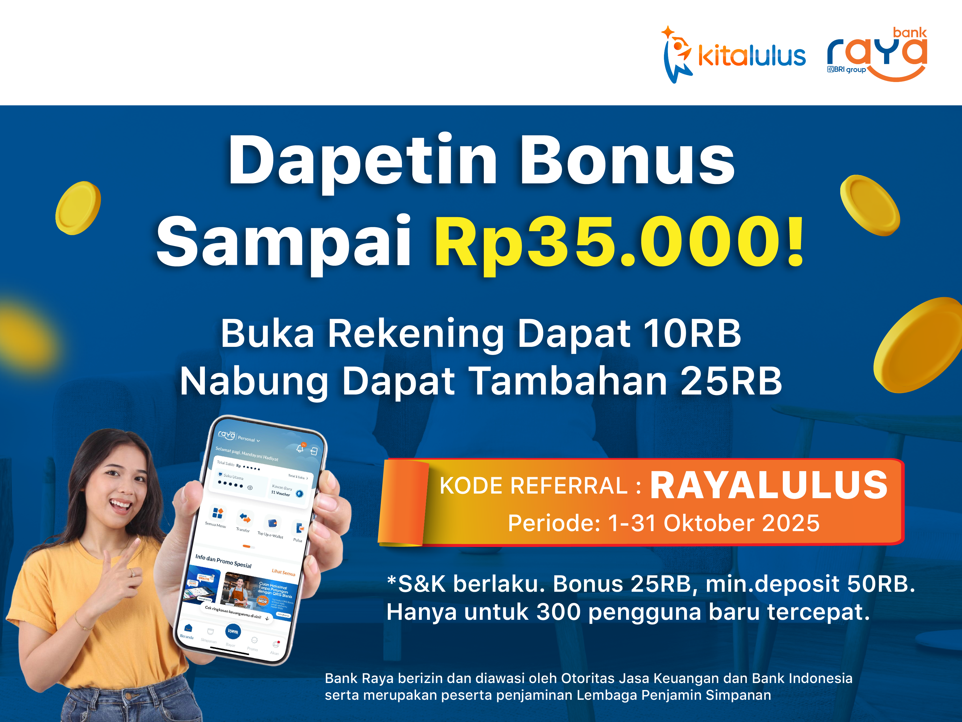 Ada promo spesial buat kamu! Buka rekening Bank Raya dengan kode referral RAYALULUS dan nikmati hadiah saldo hingga Rp35.000!